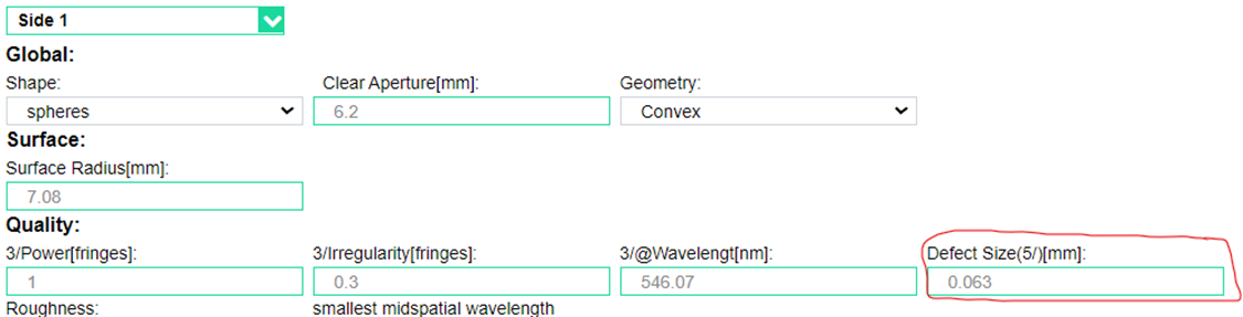 根據(jù)ISO101101標(biāo)準(zhǔn)規(guī)定,允許通過“5/y*x”參數(shù)來定義光學(xué)元件側(cè)面的最大缺陷尺寸: