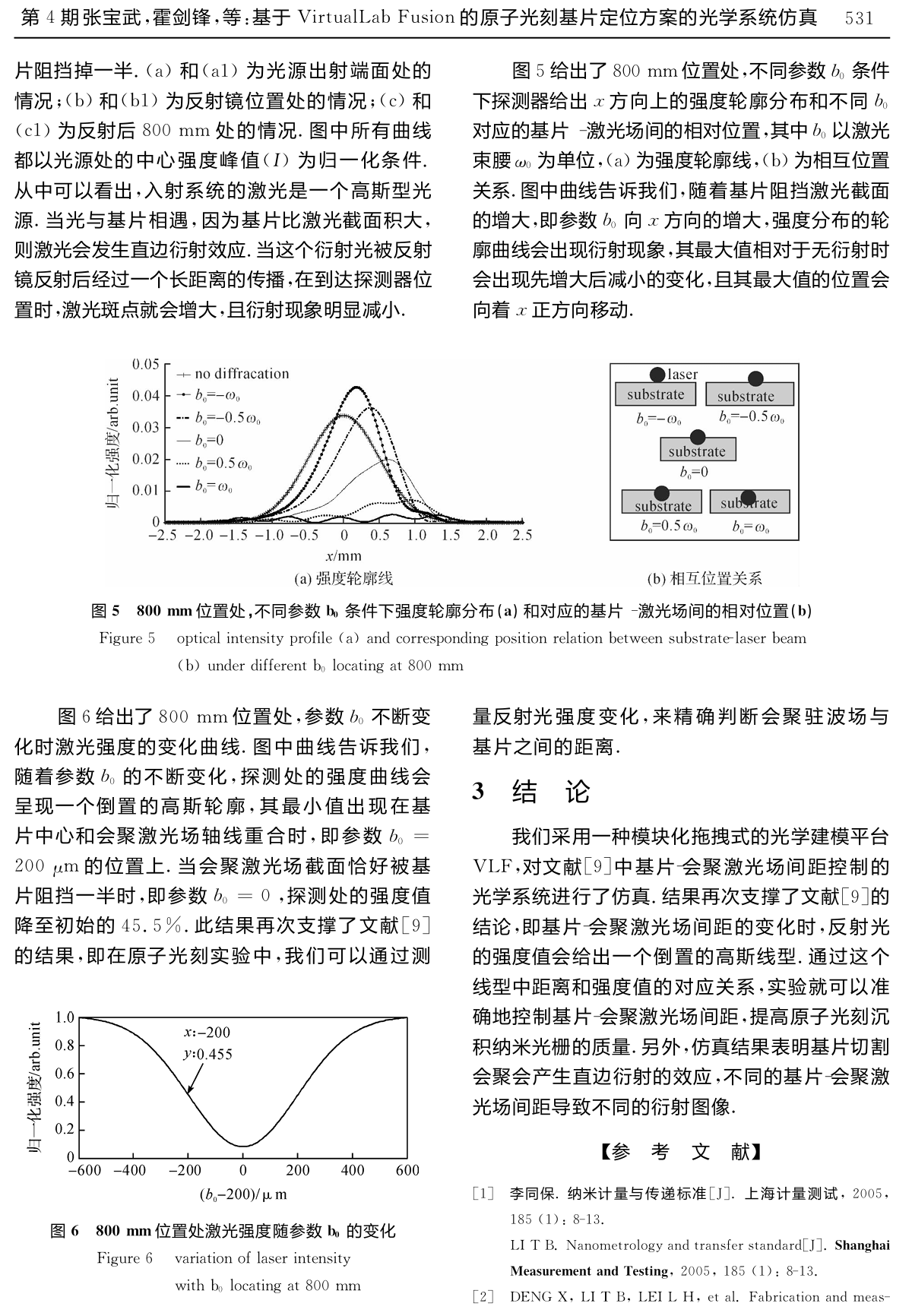 摘要:為了探究原子光刻中基片與會聚激光場間距對沉積納米光柵質(zhì)量的影響,我們基于VirtualLab Fusion平臺實現(xiàn)了基片定位控制方案中光學(xué)系統(tǒng)的建模和仿真。結(jié)果顯示:基片在切割會聚激光時將產(chǎn)生直邊衍射圖像,其輪廓形狀和最大值都會隨著基片切割激光截面區(qū)域大小的變化而變化:虛擬光電探測器上所得到的反射光強(qiáng)度值將隨著基片-會聚激光間距的變化給出了倒置的高斯線型,其最低點出現(xiàn)在基片中心和會聚激光場軸線重合時的位置上。當(dāng)會聚激光場截面恰好被基片阻擋一半時,探測處的強(qiáng)度值降至45.5%。這種光強(qiáng)隨基片位置的變化情況為精確地定位基片位置提供了理論支撐。