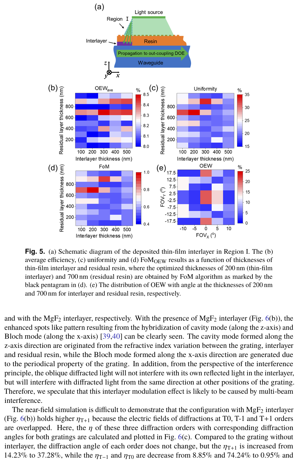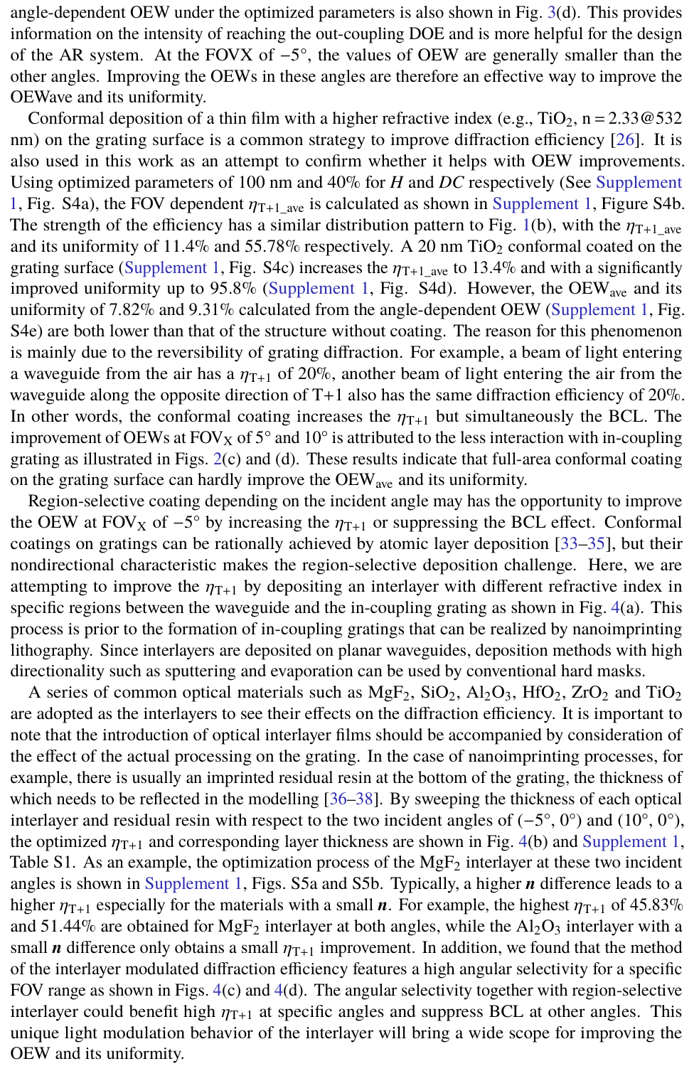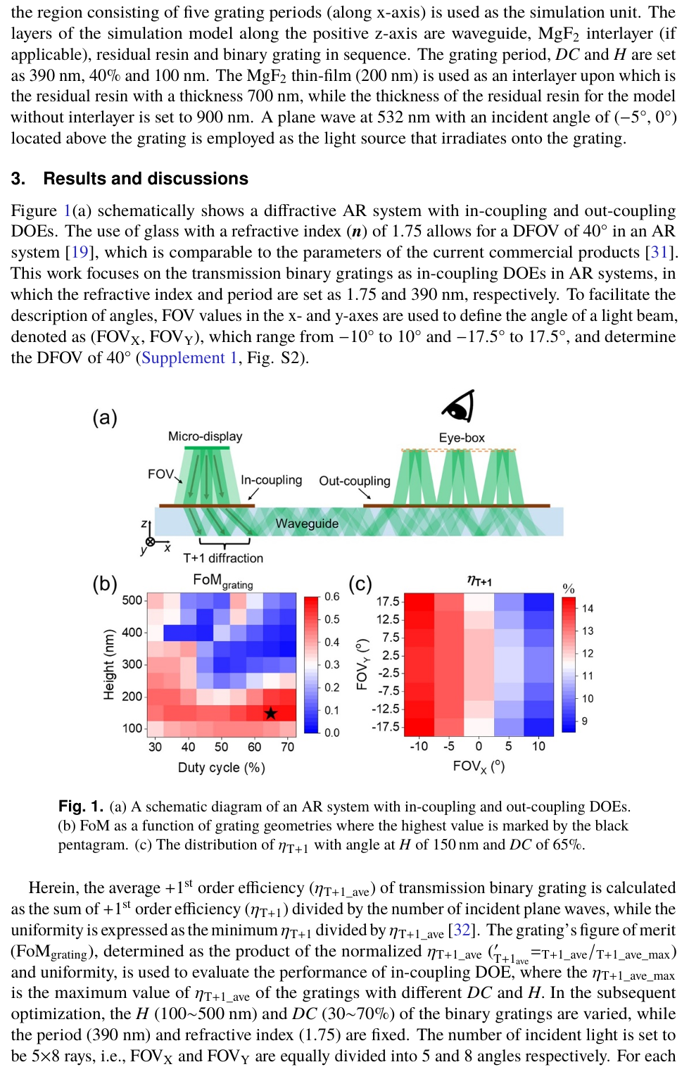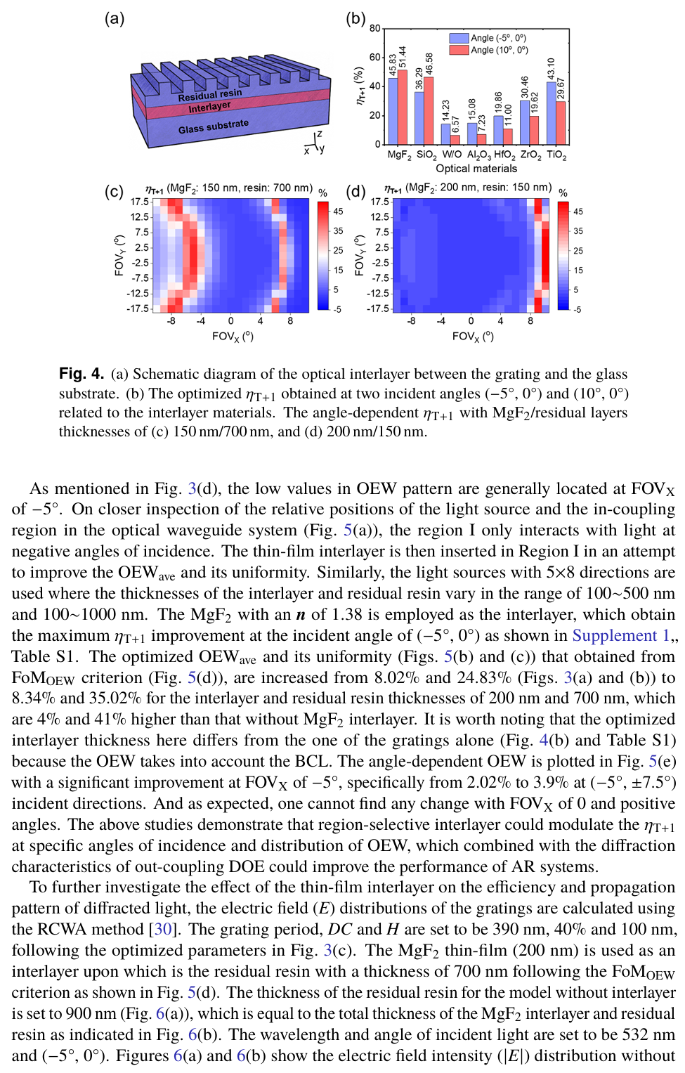 摘要:整體效率和圖像均勻性是增強現(xiàn)實顯示的重要評判標(biāo)準(zhǔn)。傳統(tǒng)的入射耦合光柵設(shè)計僅致力于提高一階衍射效率,卻未考慮光波導(dǎo)中衍射光的多次相互作用,因此存在不足。本研究中,為優(yōu)化耦合光柵設(shè)計,引入了入射耦合表面浮雕光柵的背耦合損耗(BCL),以及到達(dá)出射耦合光柵的光功率與入射光功率的比值(定義為波導(dǎo)光效率,OEW)。通過在波導(dǎo)與光柵之間插入中間層,我們展示了一種兼具獨特角度選擇性與高衍射效率的簡單有效的方案。引入?yún)^(qū)域選擇性氟化鎂(MgF₂)中間層后,在 40° 視場角下,優(yōu)化后的平均波導(dǎo)光效率從 8.02% 提升至 8.34%,其均勻性從 24.83% 提升至 35.02%。