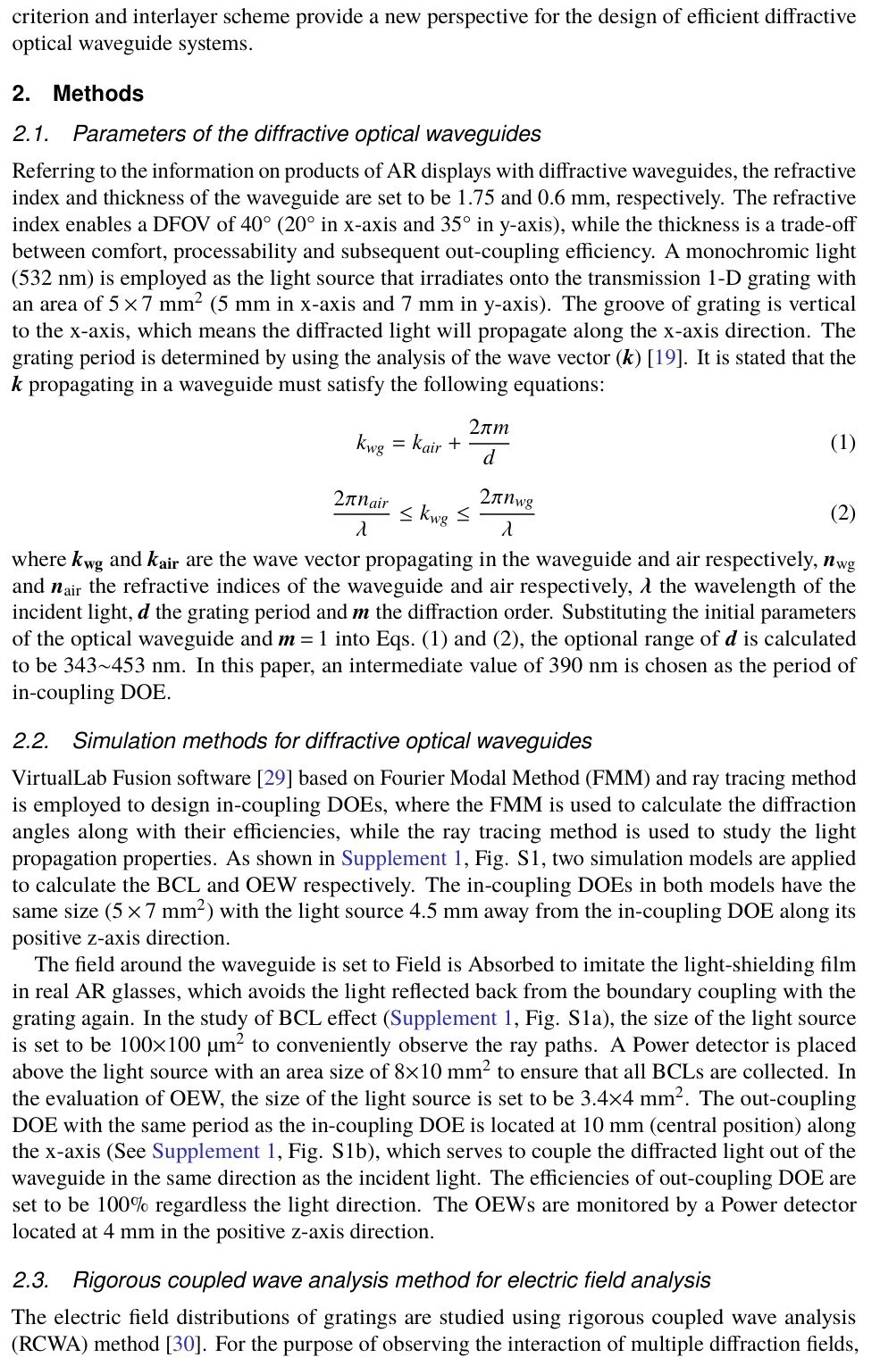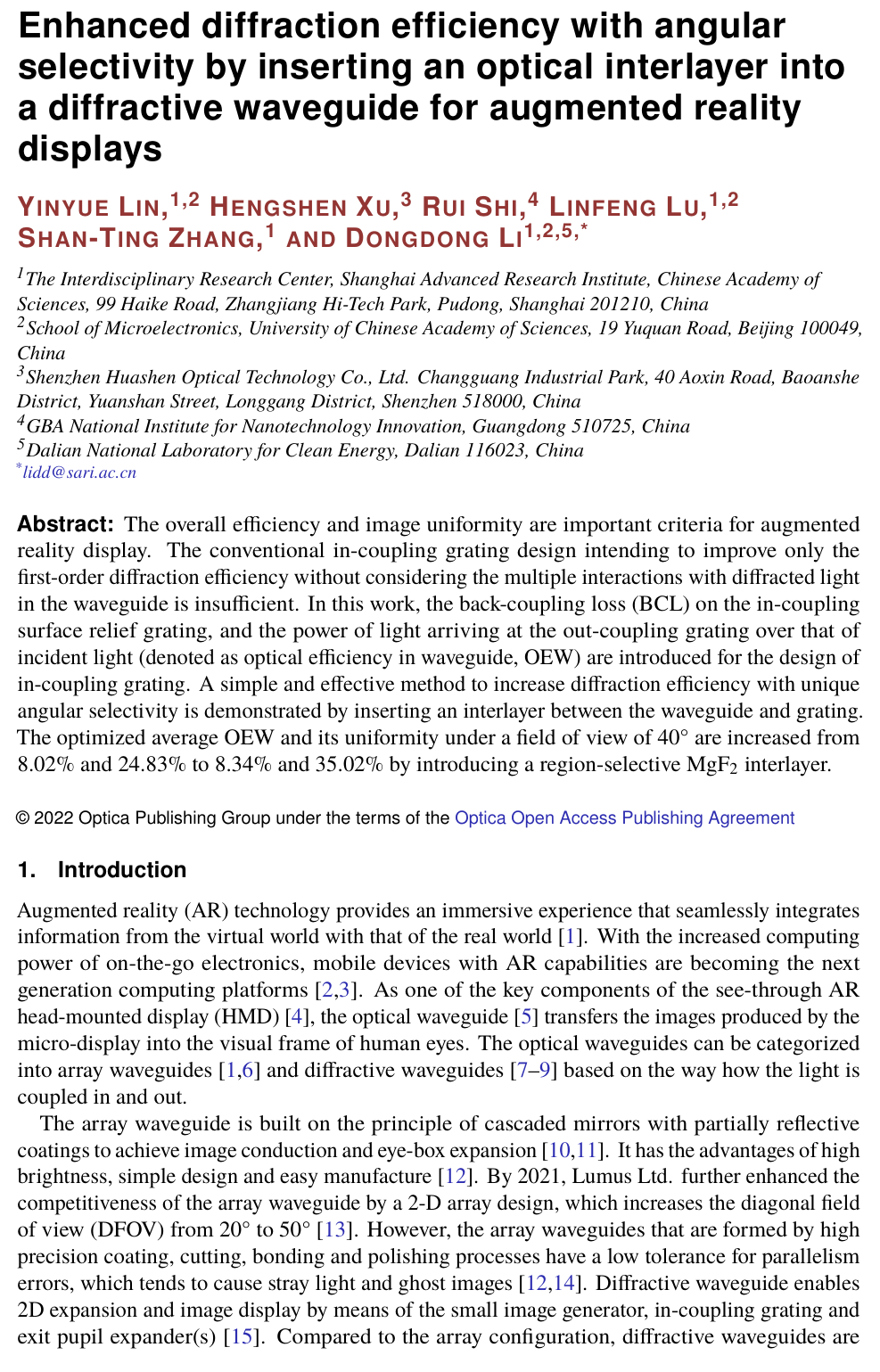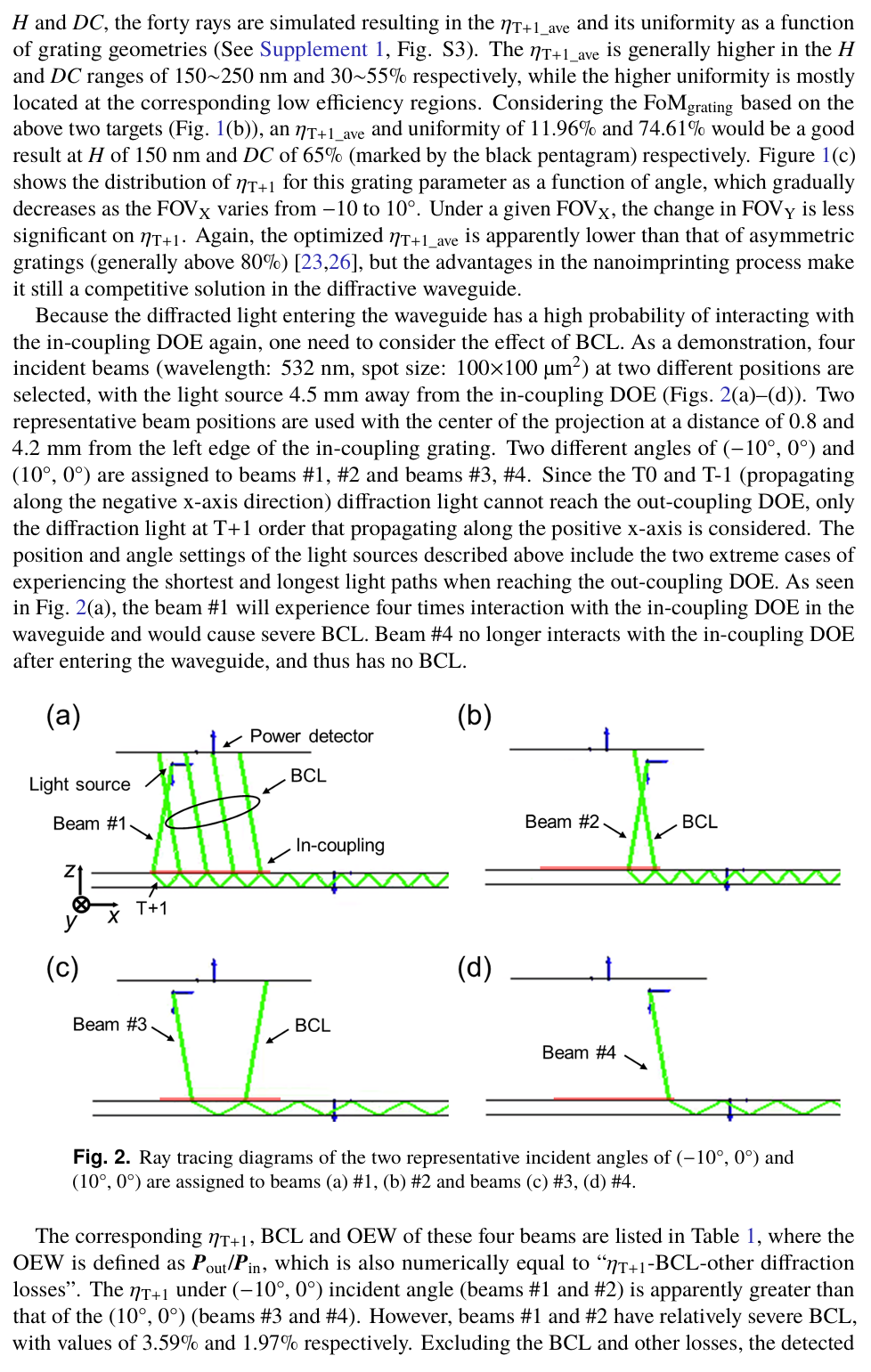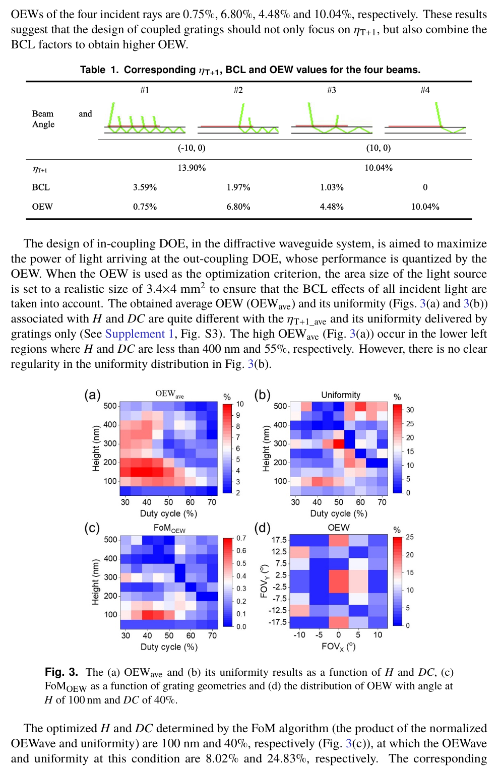摘要:整體效率和圖像均勻性是增強現(xiàn)實顯示的重要評判標(biāo)準(zhǔn)。傳統(tǒng)的入射耦合光柵設(shè)計僅致力于提高一階衍射效率,卻未考慮光波導(dǎo)中衍射光的多次相互作用,因此存在不足。本研究中,為優(yōu)化耦合光柵設(shè)計,引入了入射耦合表面浮雕光柵的背耦合損耗(BCL),以及到達(dá)出射耦合光柵的光功率與入射光功率的比值(定義為波導(dǎo)光效率,OEW)。通過在波導(dǎo)與光柵之間插入中間層,我們展示了一種兼具獨特角度選擇性與高衍射效率的簡單有效的方案。引入?yún)^(qū)域選擇性氟化鎂(MgF₂)中間層后,在 40° 視場角下,優(yōu)化后的平均波導(dǎo)光效率從 8.02% 提升至 8.34%,其均勻性從 24.83% 提升至 35.02%。